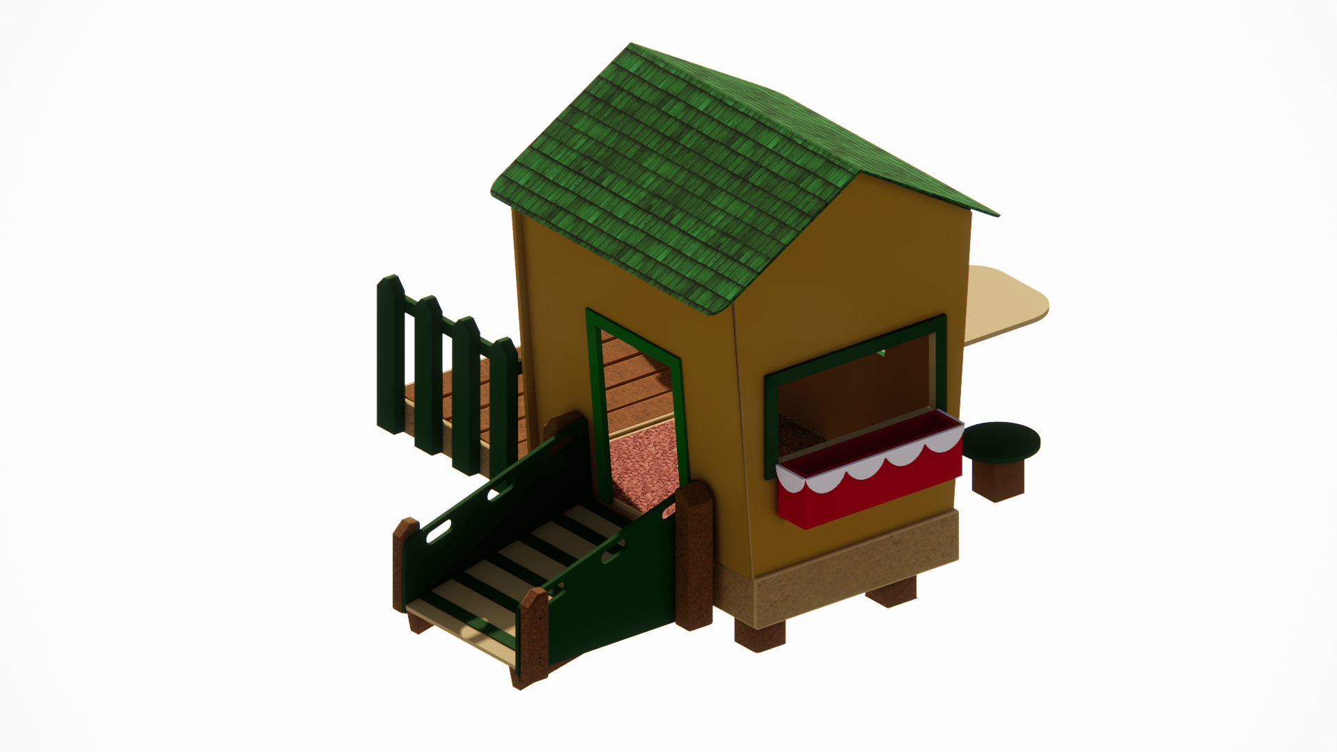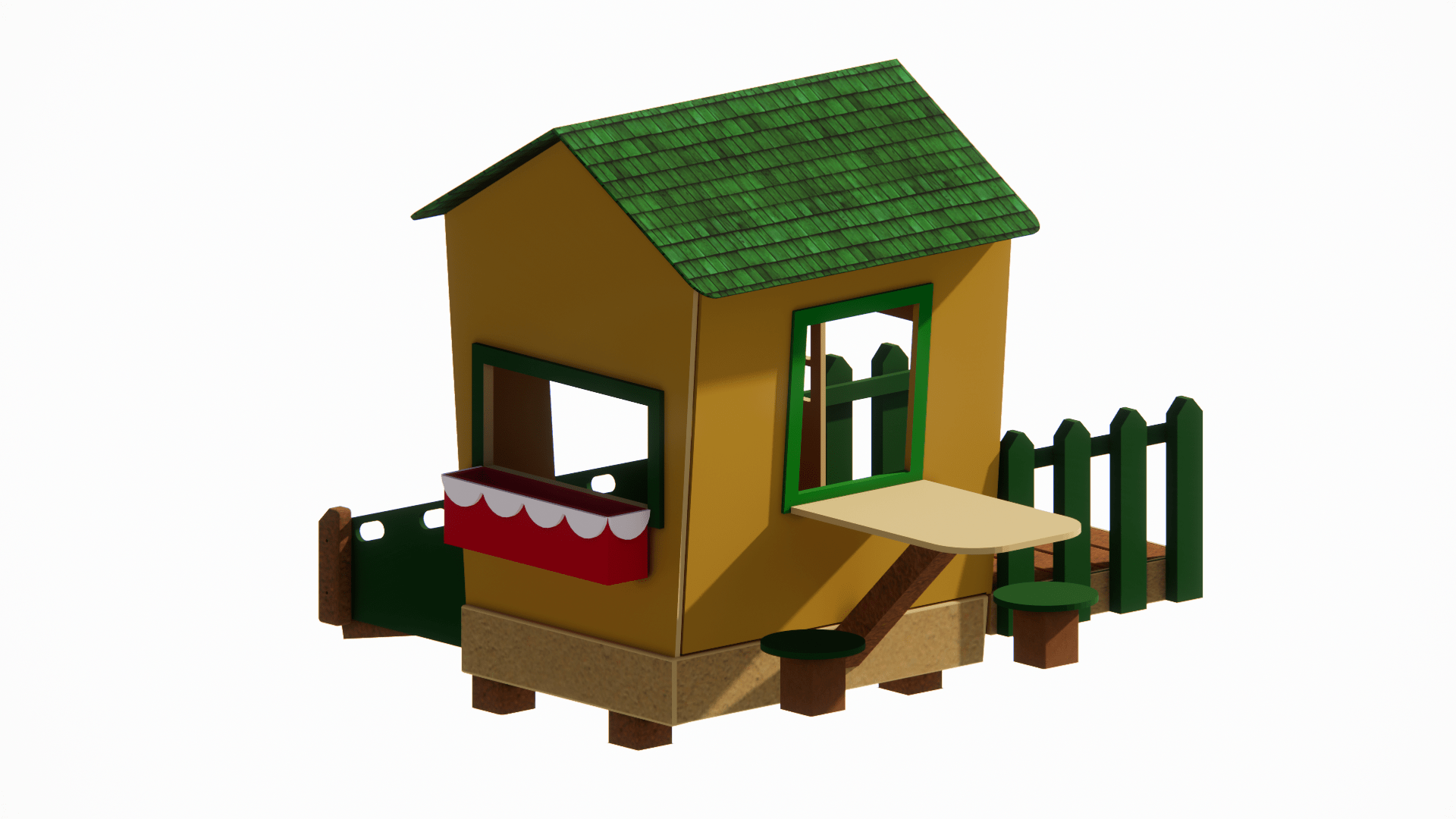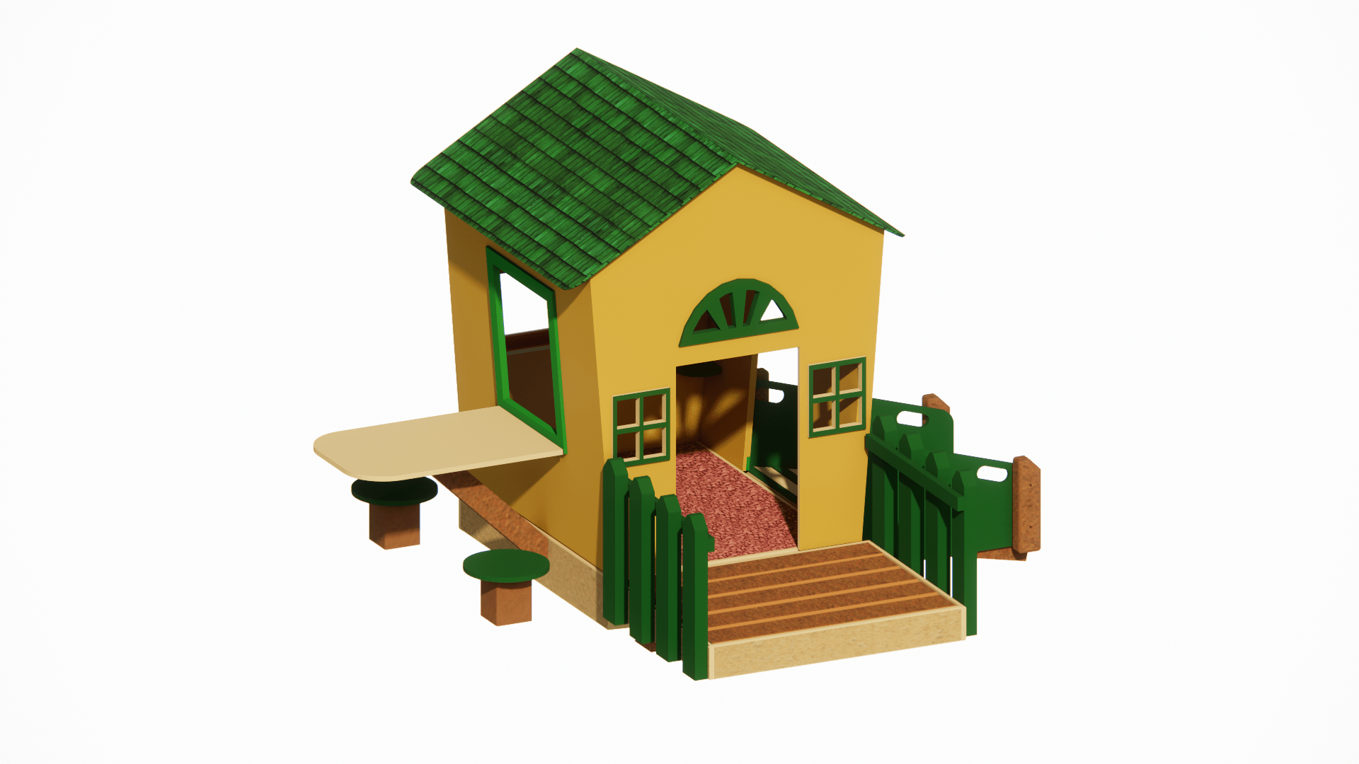 The Cozy Cottage brings storybook charm to any play space with its inviting design and thoughtful details. Its trapezoidal shape gives it a whimsical feel, while the sunburst pediment above the front entryway adds a classic touch. Flanking the entrance, two charming windows welcome little ones inside. On the left side, a window with an outdoor table and two stools creates a perfect spot for pretend café play. The back wall features another window adorned with a flower box, adding to the cottage’s warm and playful character. A second entryway on the right leads to a gentle ramp, offering easy access back outside. Sitting on a raised platform, the front of the cottage resembles a cozy patio, complete with a small green picket fence on both sides. Designed for imaginative play and social interaction, the Cozy Cottage makes a delightful standalone feature or a charming addition to a larger playground.