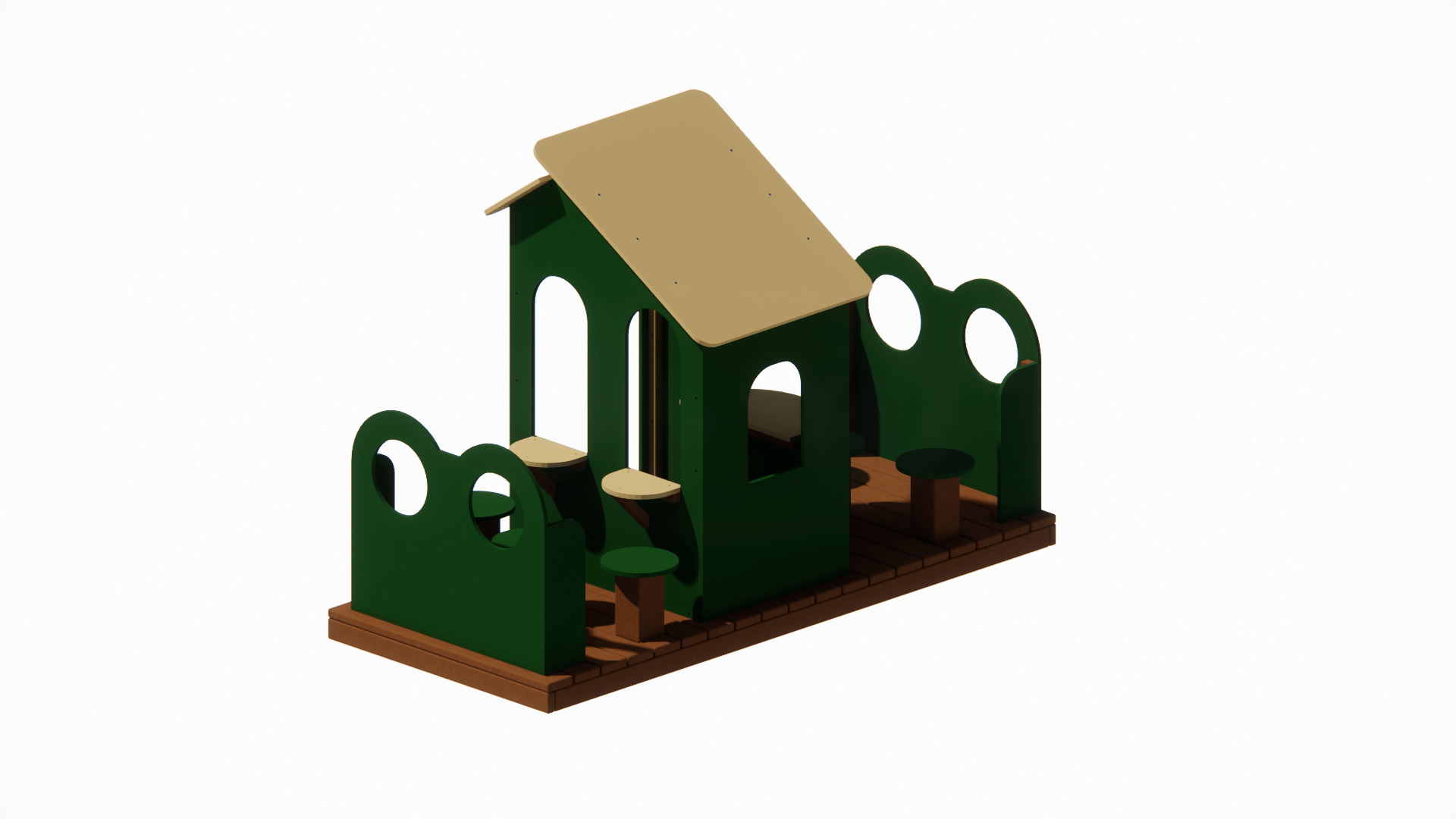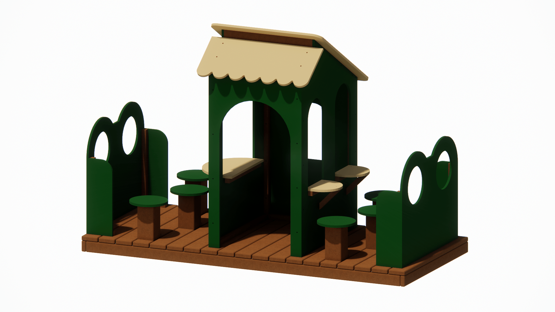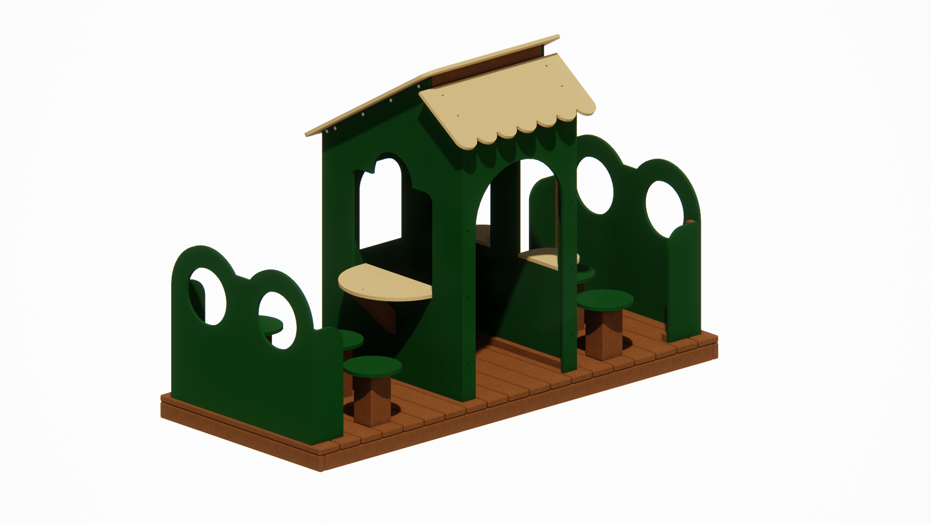 The Ice Cream Adventure brings the fun of an ice cream shop to the playground, sparking imaginative play and social interaction. Built on a sturdy platform, this charming playhouse features a central structure with open windows on the back and sides, creating a welcoming space for young shopkeepers and customers alike. Each side window has two stools and built-in counters to mimic an ice cream shop. Crafted from durable HDPE, it withstands years of active play. This engaging playhouse is a delightful standalone feature or a playful addition to a larger playground design.